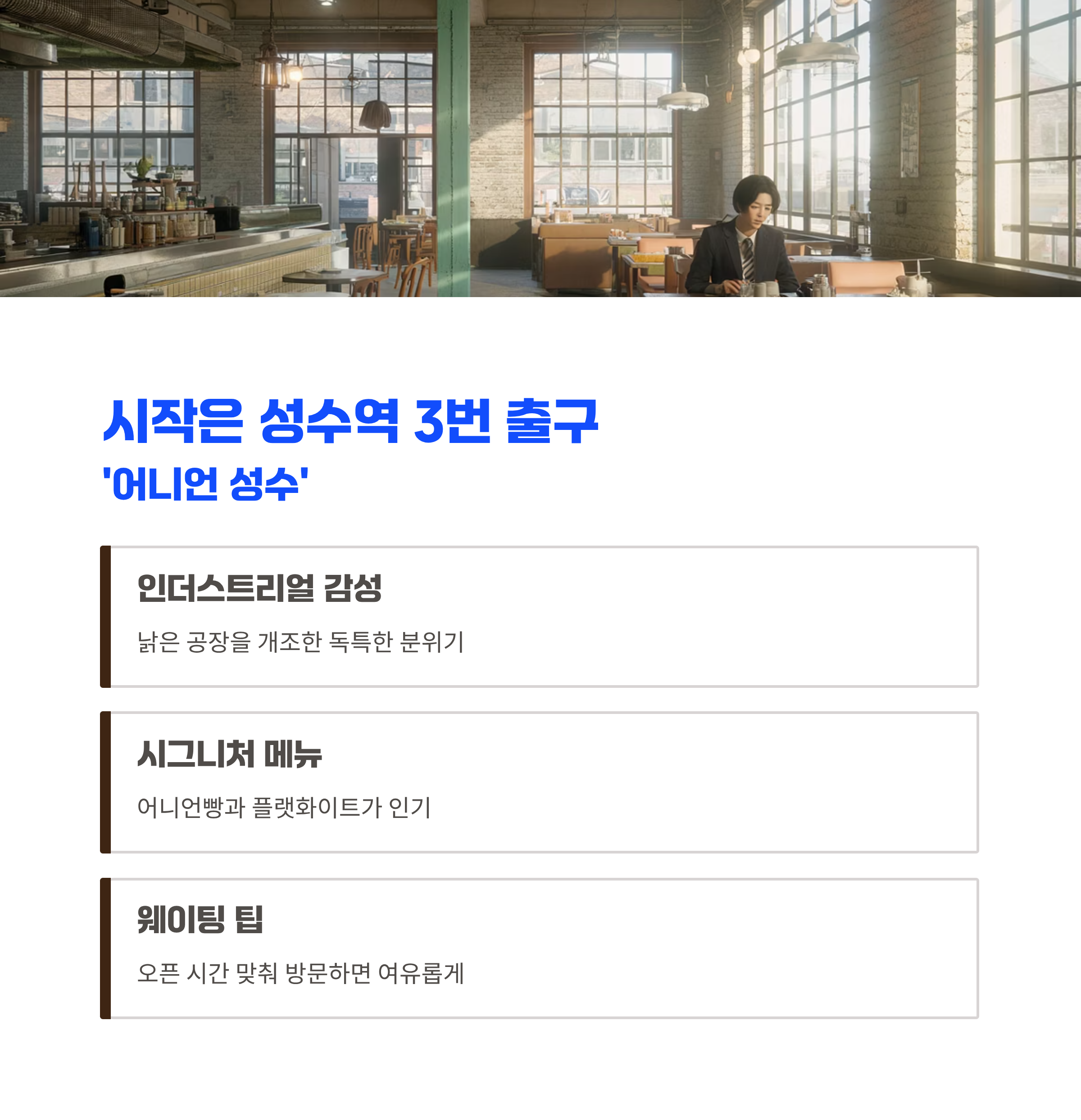 | ① | 어니언 성수 | 성수역 3번 출구 도보 3분 | 베이커리 & 인더스트리얼 감성 |