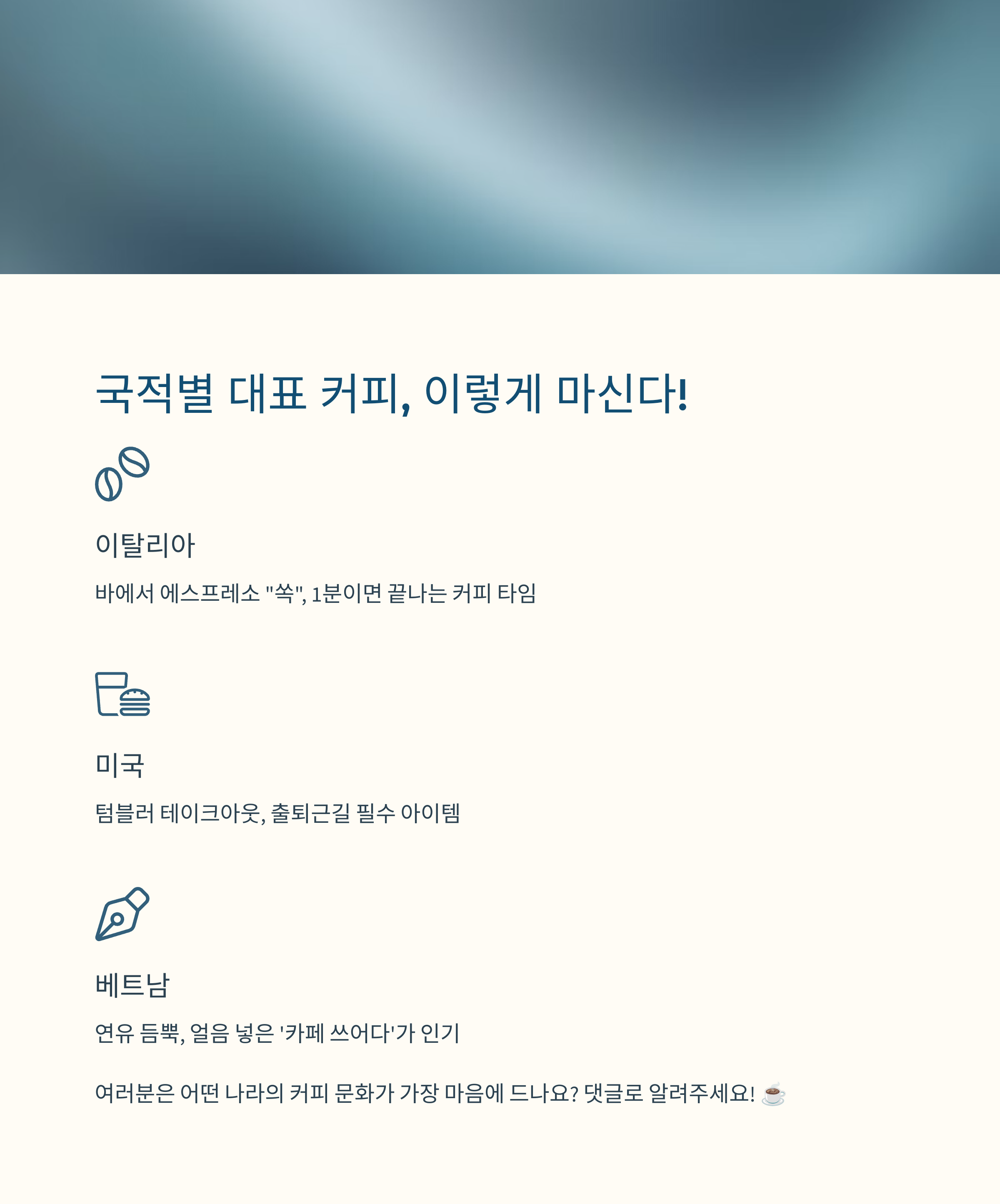 이번 글에서는 주요 국가의 대표적인 커피 문화 특징을 소개합니다.