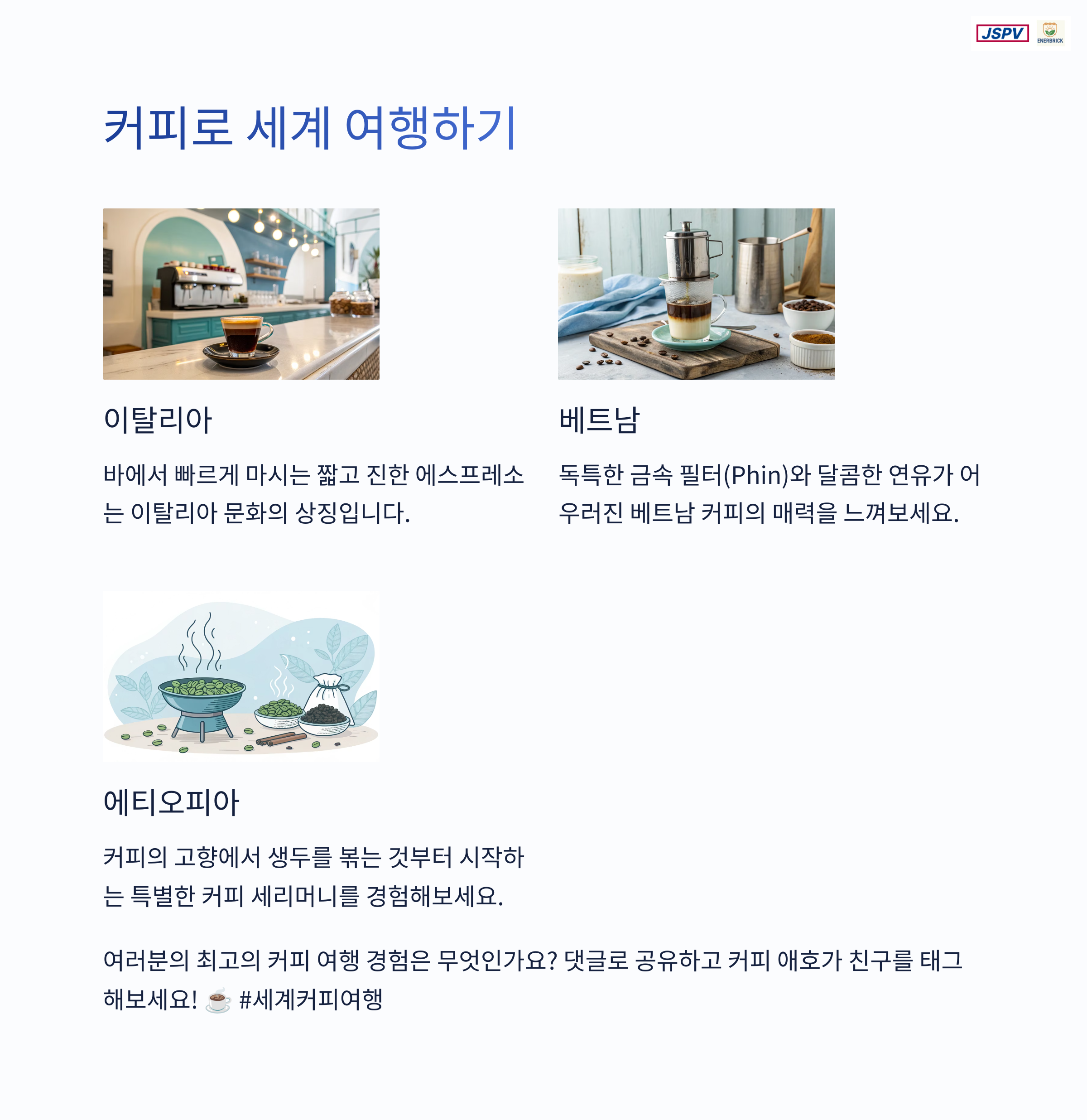 세계 곳곳을 여행하며 맛보는 커피는 단순한 음료를 넘어 문화와 정서, 그 나라만의 감성을 담고 있습니다. 아침을 여는 이탈리아의 에스프레소부터 무더위를 식히는 베트남의 연유 커피까지, 다양한 커피 스타일은 여행자에게 특별한 경험을 선사합니다. 본 글에서는 각국에서 만난 독특한 커피 문화를 소개하며, 잊지 못할 한 잔의 여정을 함께 떠나보겠습니다.