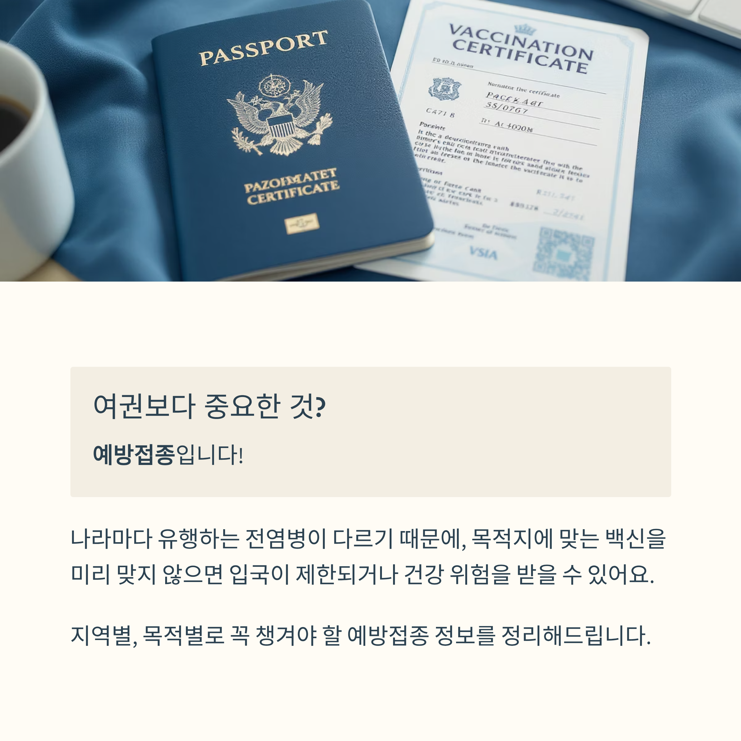 설레는 해외여행을 앞두고 짐 싸느라 바쁘시죠? 그런데 여권보다 더 중요한 게 있다는 사실, 알고 계셨나요? 바로 예방접종입니다. 나라마다 유행하는 전염병이 다르기 때문에, 목적지에 맞는 백신을 미리 맞지 않으면 입국이 제한되거나, 건강에 큰 위협을 받을 수 있어요. 이 글에서는 지역별, 목적별로 꼭 챙겨야 할 예방접종 정보를 정리해 드립니다.