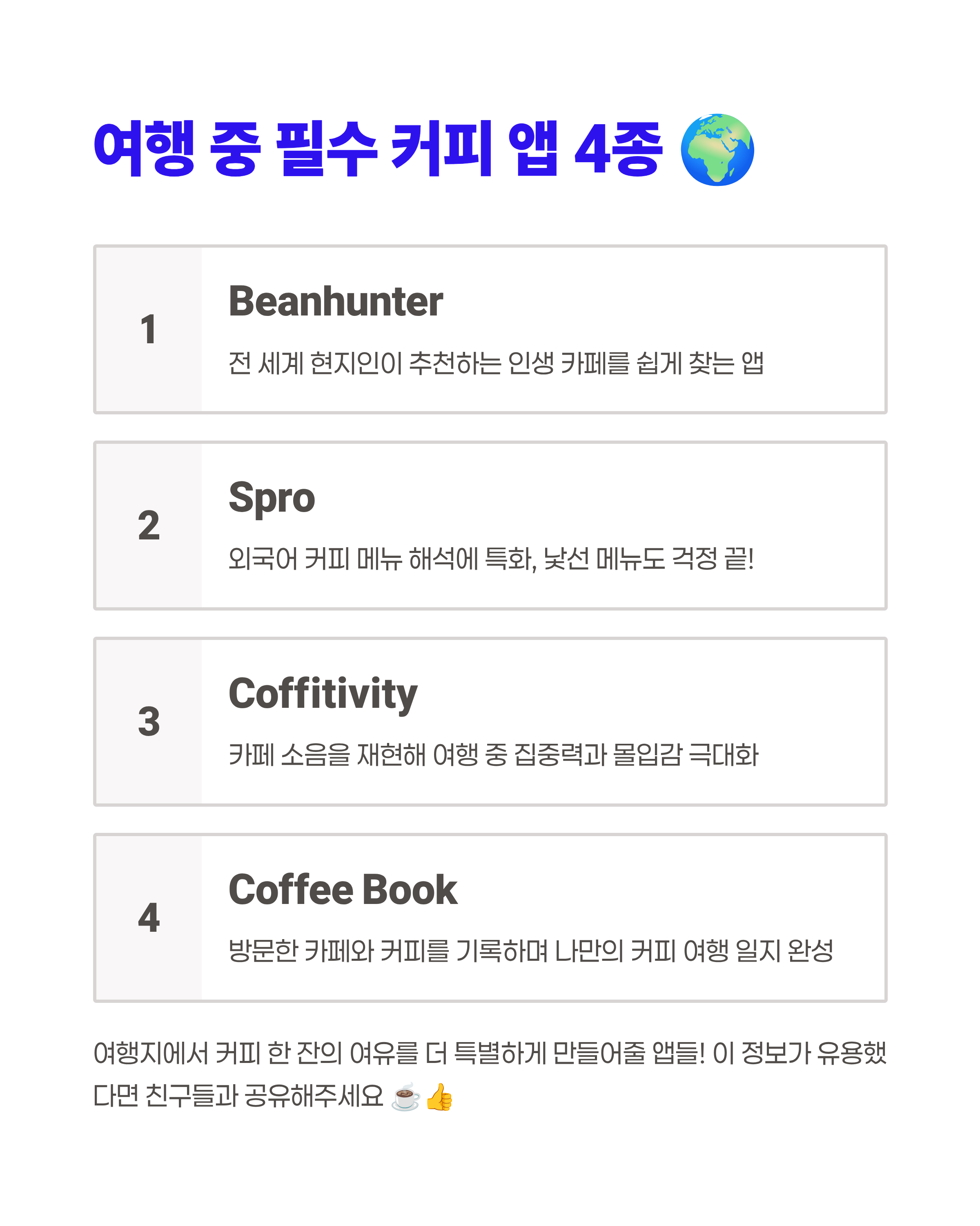 여행 중 커피를 풍성하게 만들어주는 유용한 플랫폼들을 소개합니다.