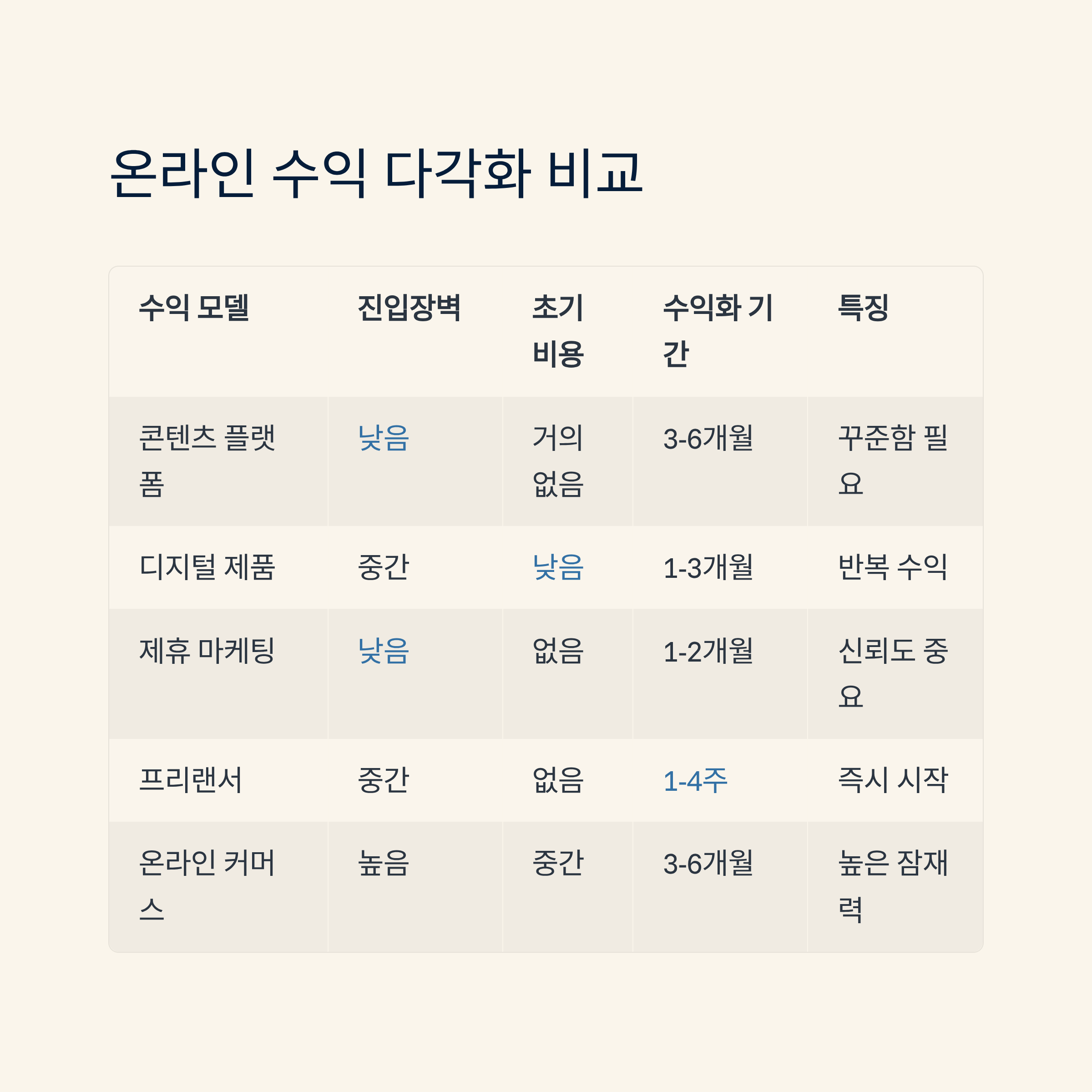 | 제휴 마케팅 | 낮음 | 없음 | 1~2개월 |