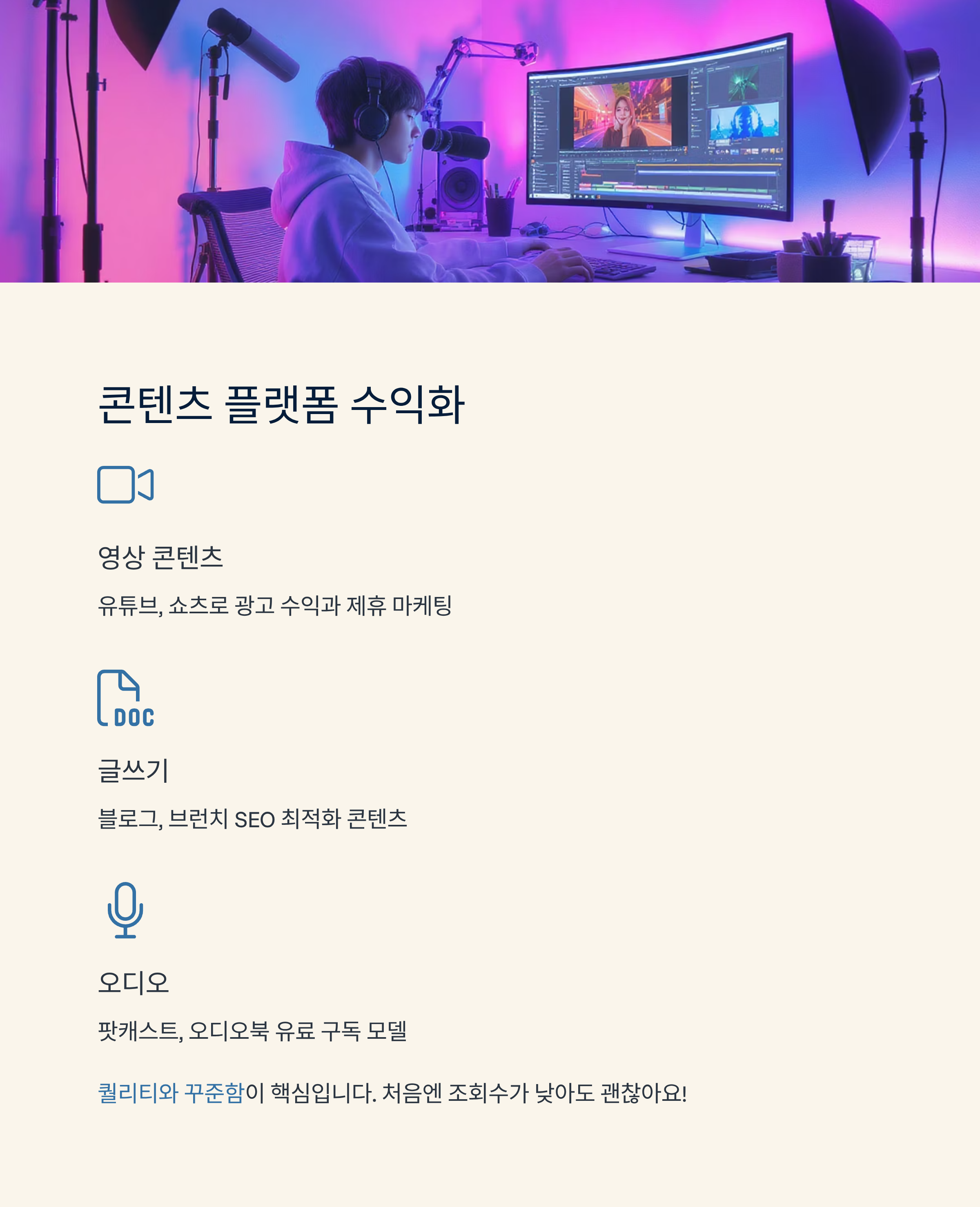 유튜브, 블로그, 인스타그램, 브런치, 팟캐스트 등 다양한 콘텐츠 플랫폼을 활용하면 광고 수익부터 제휴 마케팅, 유료 구독 모델까지 수익 창출이 가능합니다.