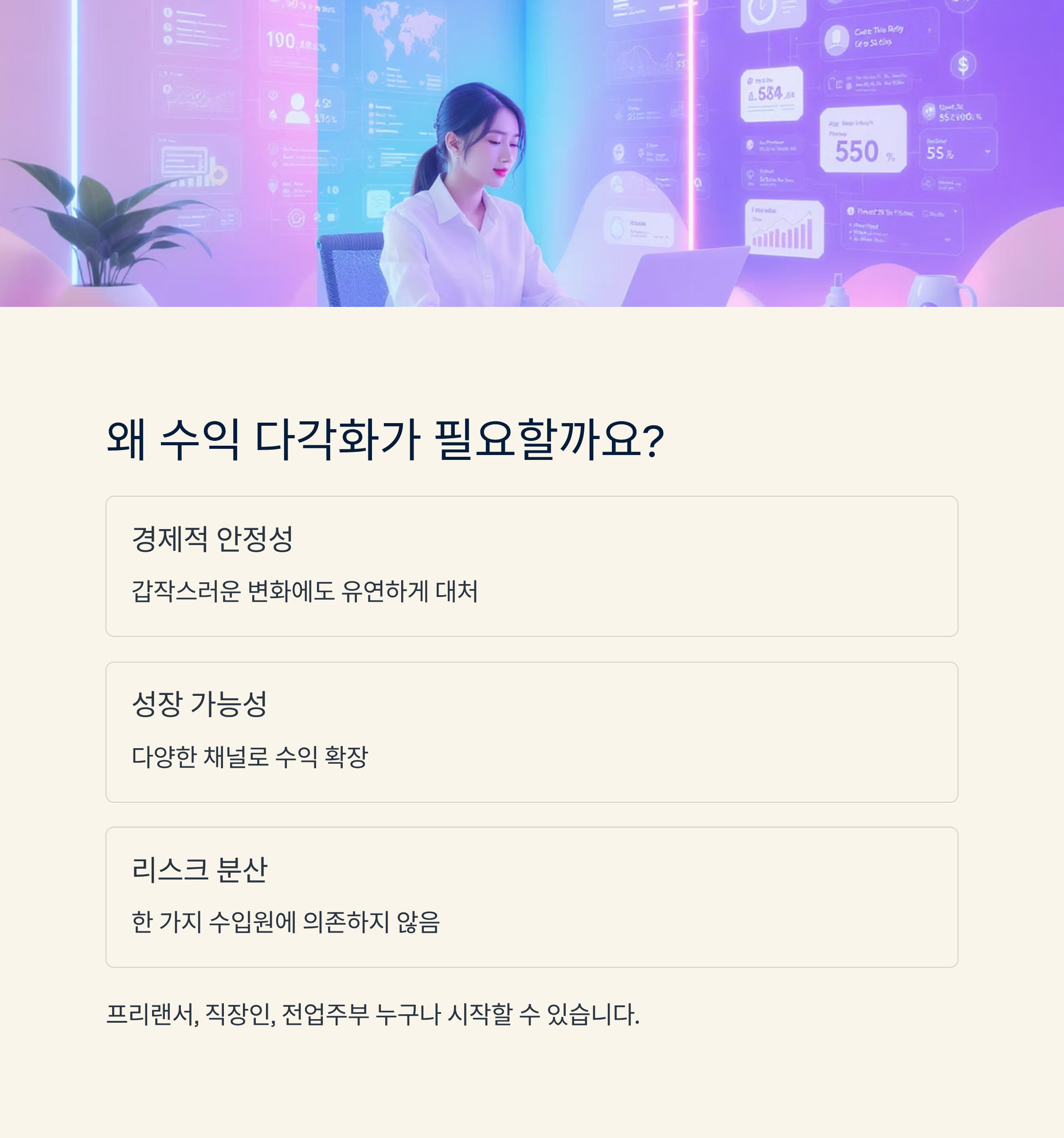 한 가지 수입원에만 의존하는 시대는 끝났습니다. 온라인을 통해 다양한 채널로 수익을 창출하는 것이 점점 더 중요해지고 있는데요. 경제 위기나 갑작스러운 변화에도 유연하게 대처할 수 있기 때문입니다. 이번 글에서는 온라인 수익 다각화를 처음 시작하는 분들을 위해 꼭 알아야 할 전략과 실천 팁을 소개합니다. 수익 구조를 넓히고 싶은 프리랜서, 직장인, 전업주부 누구나 도움이 될 수 있는 내용입니다.