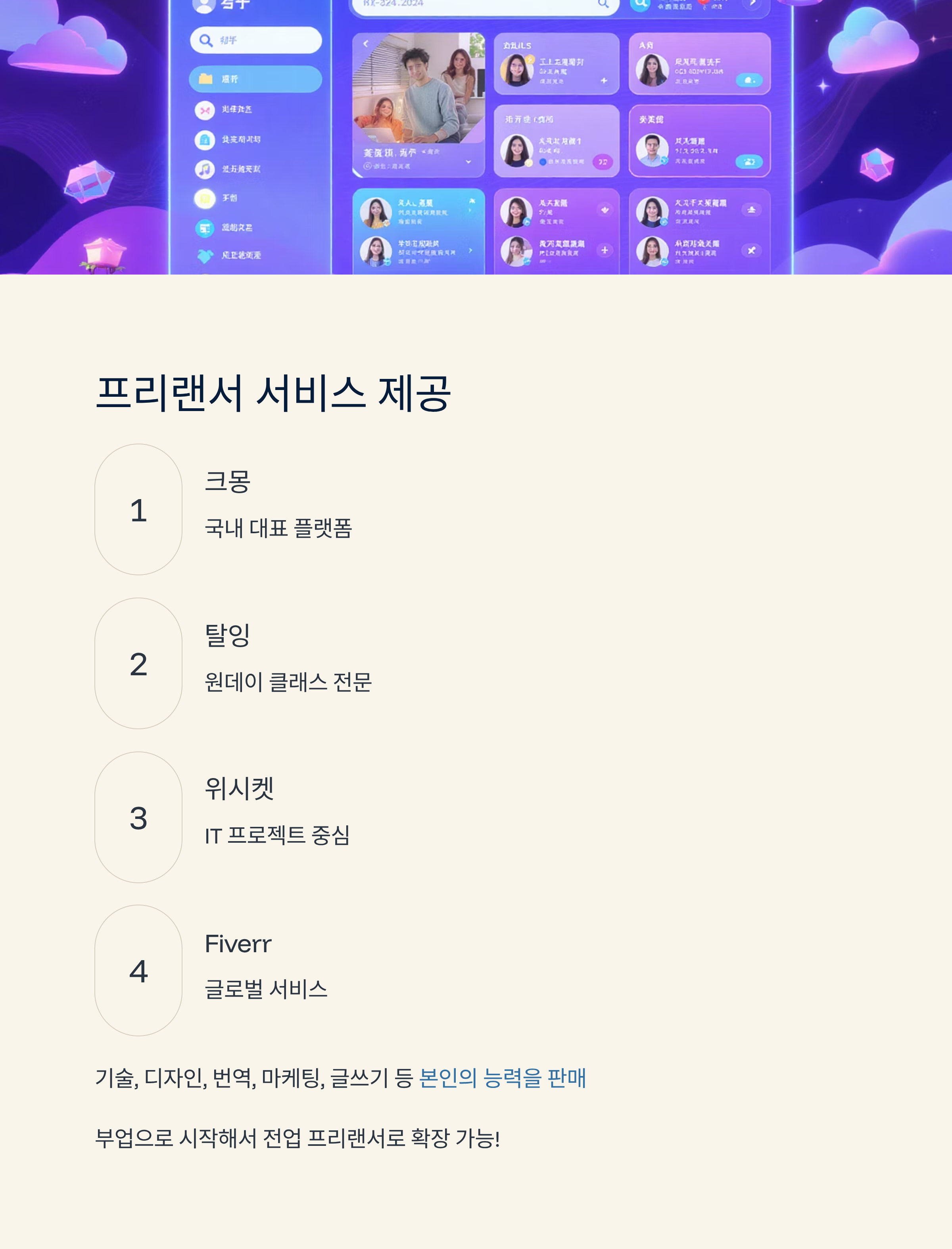 본업 외에 부업으로 시작할 수도 있고, 점차 확장해 전업 프리랜서로도 전환이 가능합니다.