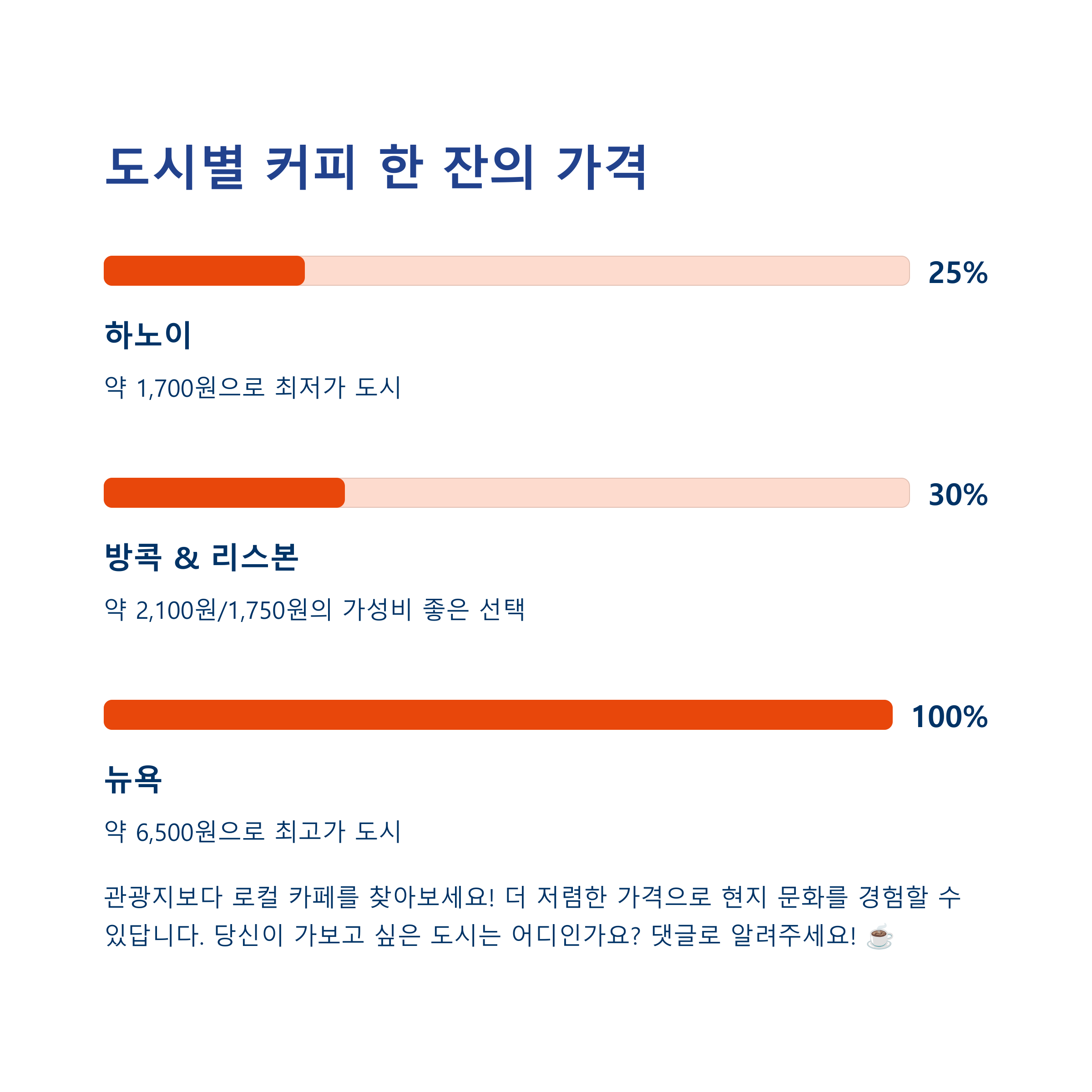 여행 중 카페에서 마시는 커피는 작은 사치이자 큰 행복입니다. 하지만 나라마다 커피 가격은 상이하며, 물가나 환율에 따라 그 차이는 더욱 벌어집니다. 이 글에서는 2025년 기준, 실제 여행자들이 자주 찾는 도시의 평균 커피 가격을 한화 기준으로 정리하고, 가성비가 뛰어난 지역까지 분석해 드립니다. 효율적인 예산 계획에 꼭 참고해 보세요.