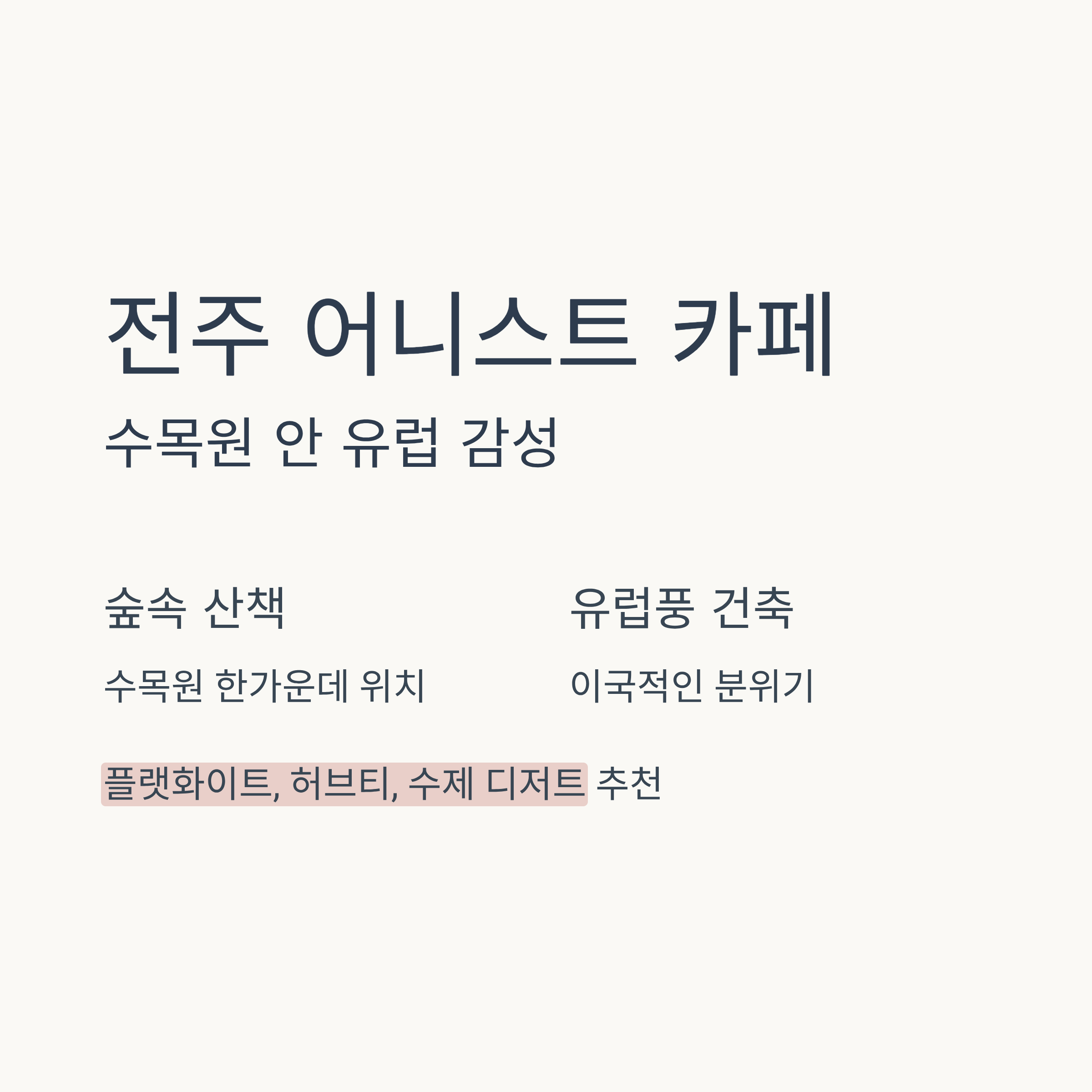 | 전주 | 어니스트 카페 | 수목원, 유럽풍 | 플랫화이트 |