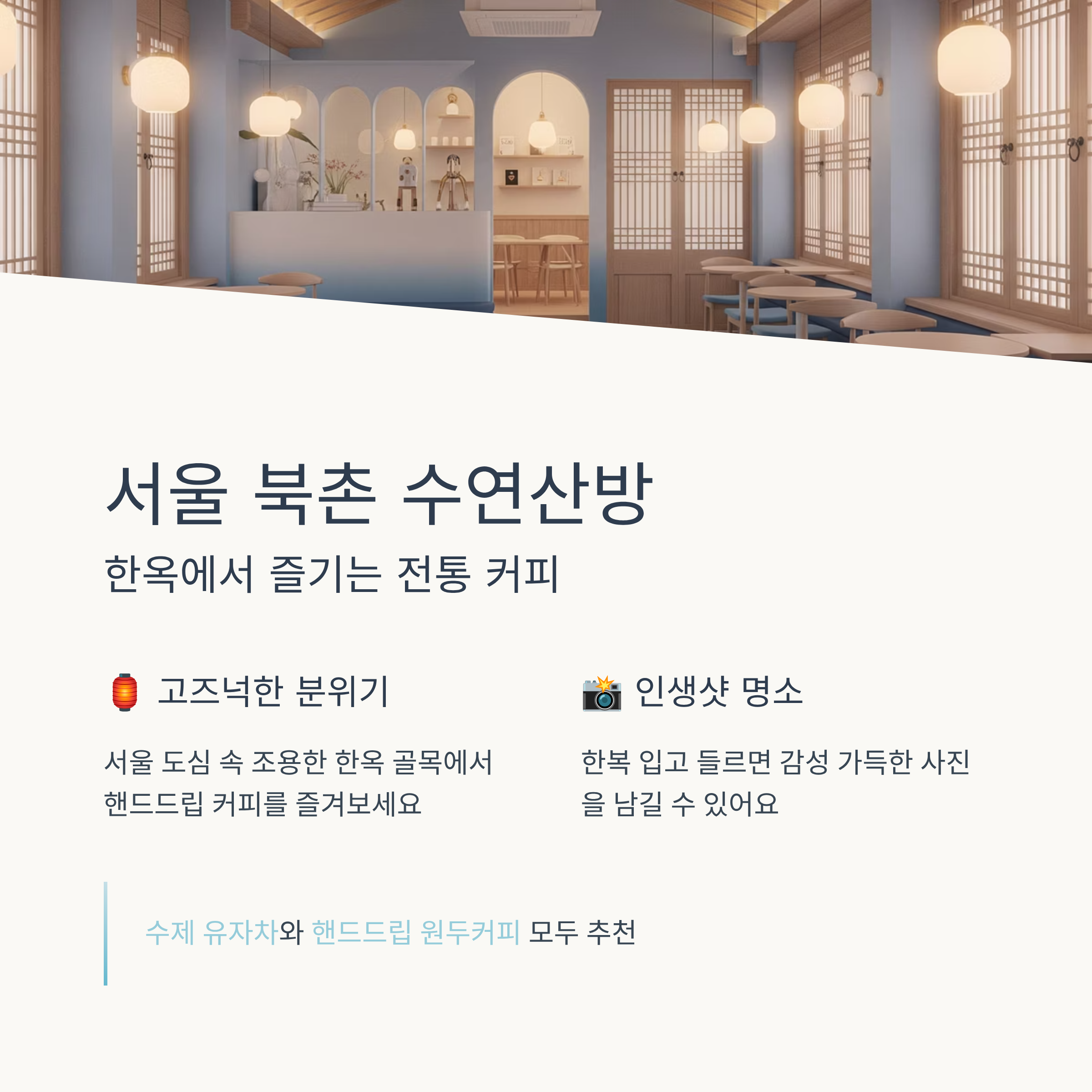 | 서울 | 북촌 수연산방 | 한옥, 전통 분위기 | 핸드드립 커피 |
