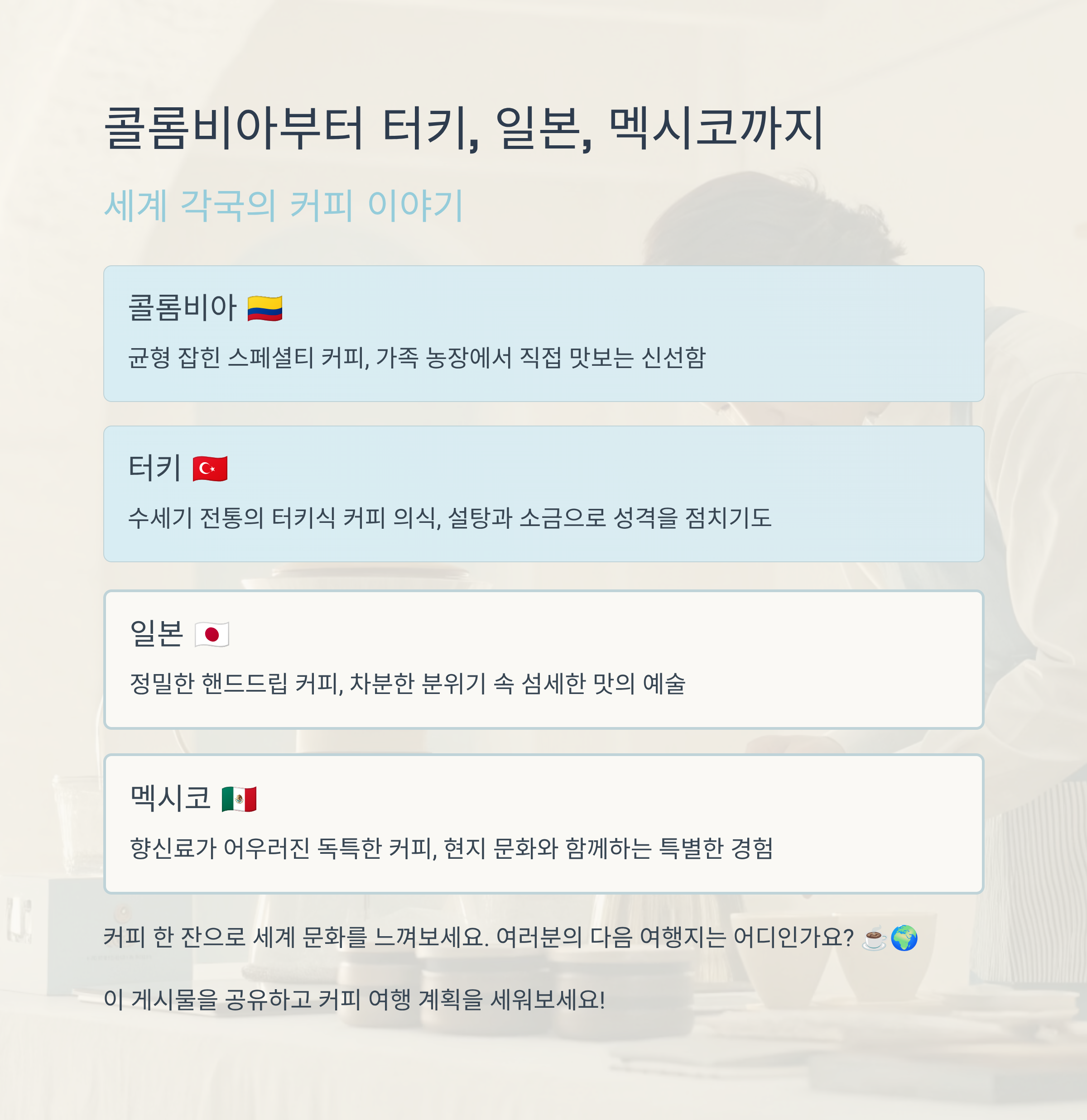여행의 즐거움은 단순한 풍경이나 음식만이 아닙니다. 전 세계 곳곳의 커피 한 잔에는 그 지역의 문화, 기후, 삶의 방식이 녹아 있죠. 이번 글에서는 커피 애호가들을 위한 여행지별 커피 테이스팅 포인트를 정리해 보았습니다. 각 나라에서만 느낄 수 있는 커피의 향과 맛, 분위기를 함께 경험해 보세요.