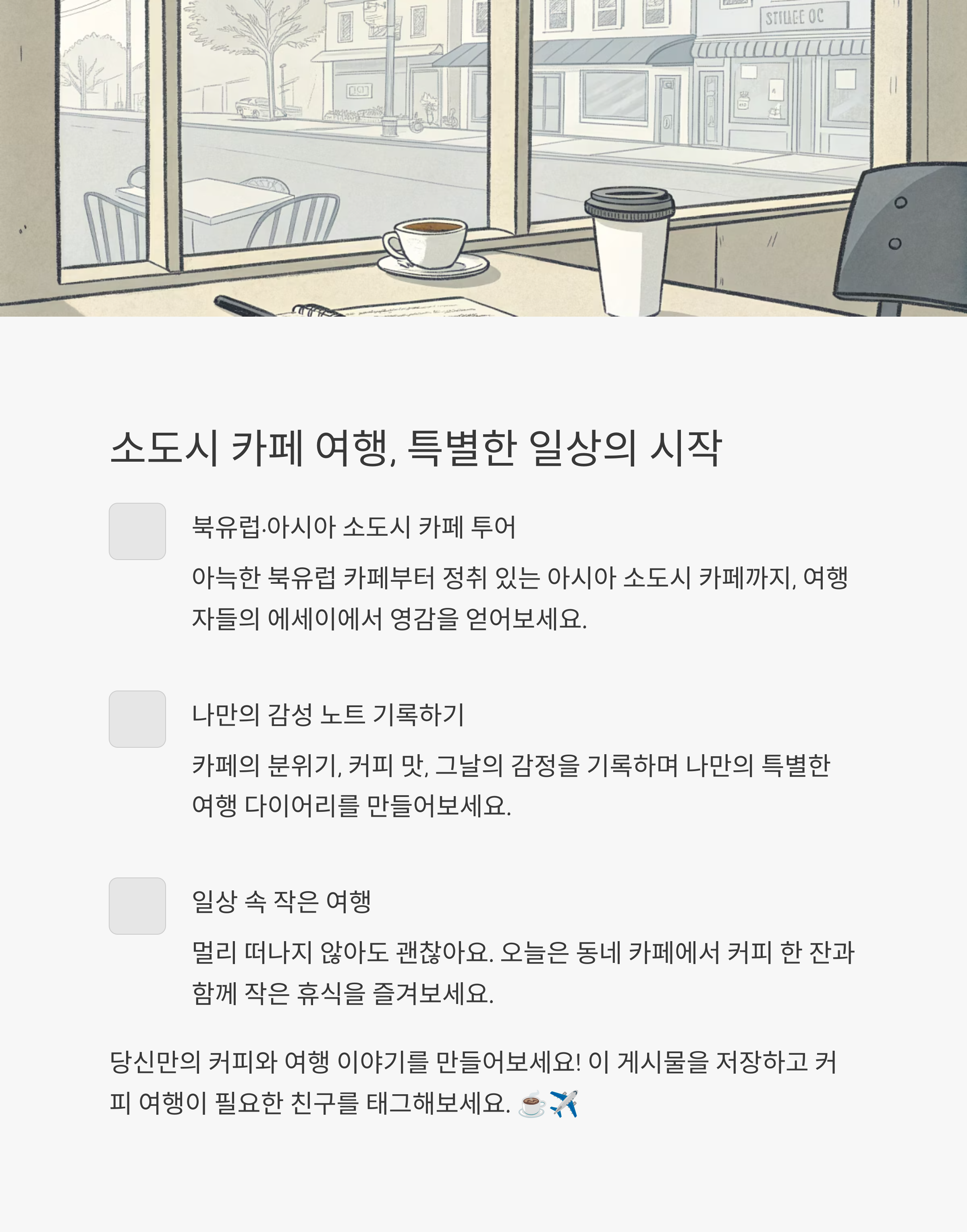 커피 한 잔이 주는 여유, 낯선 도시에서의 느긋한 산책.