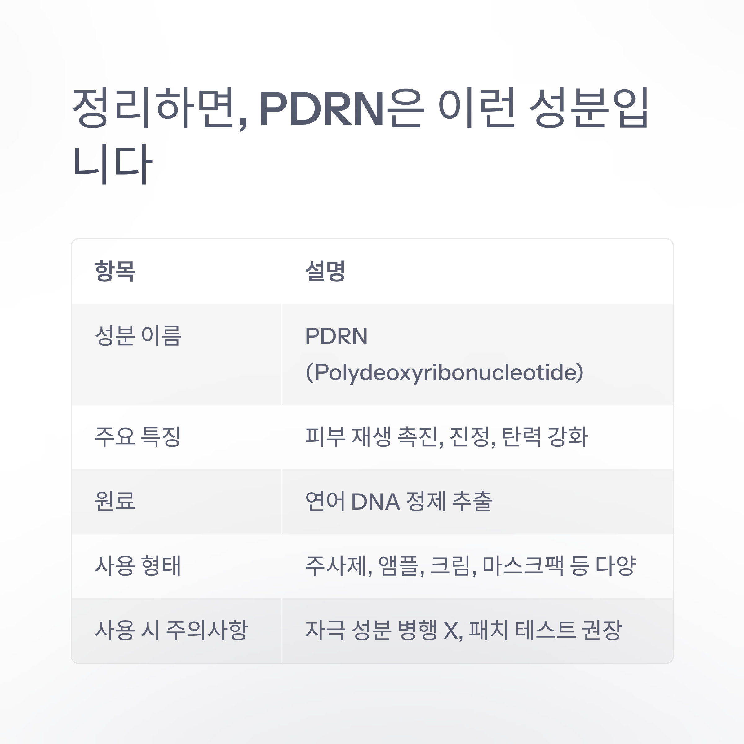 정리하면, PDRN은 이런 성분입니다