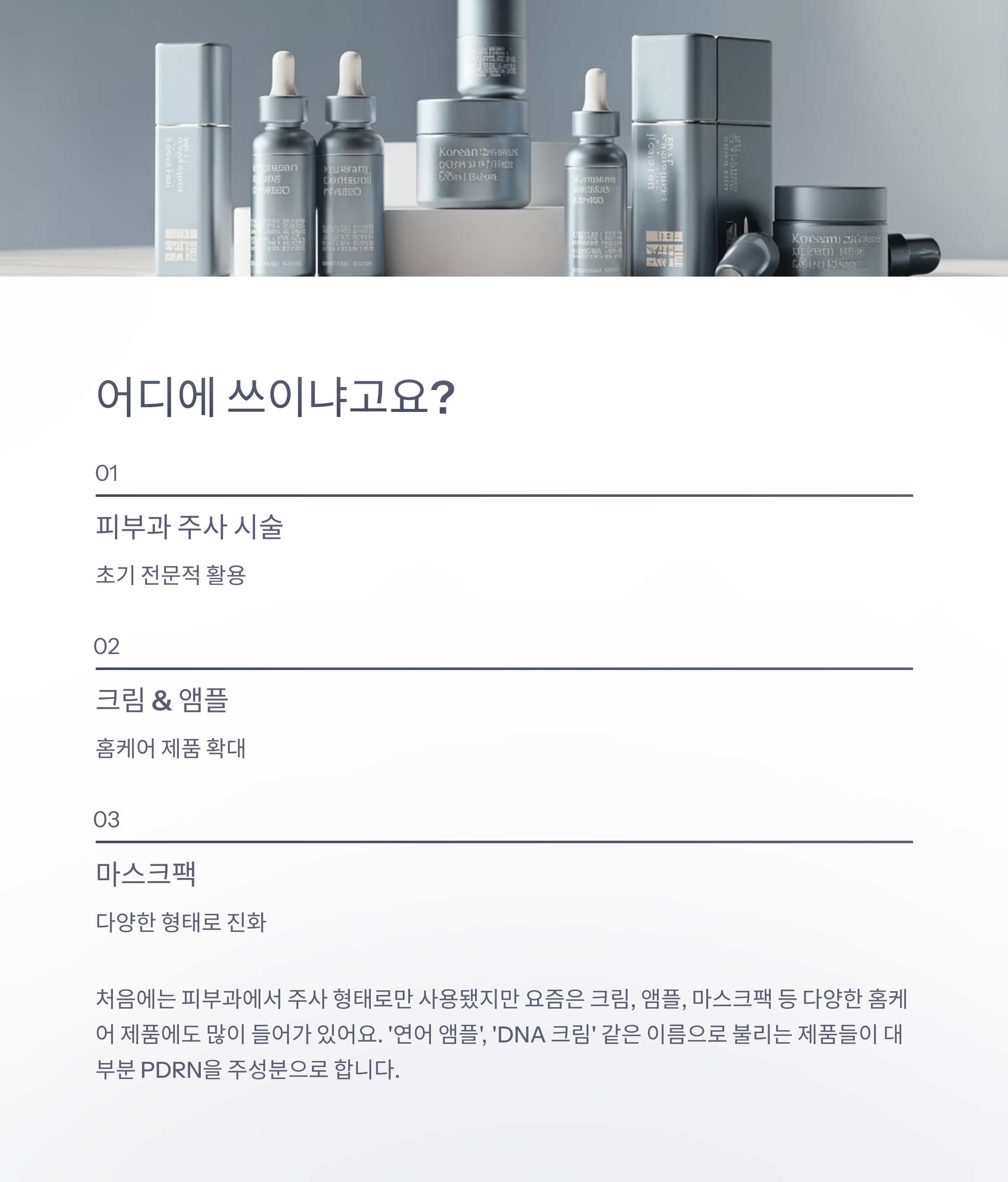 | 사용 형태 | 주사제, 앰플, 크림, 마스크팩 등 다양 |