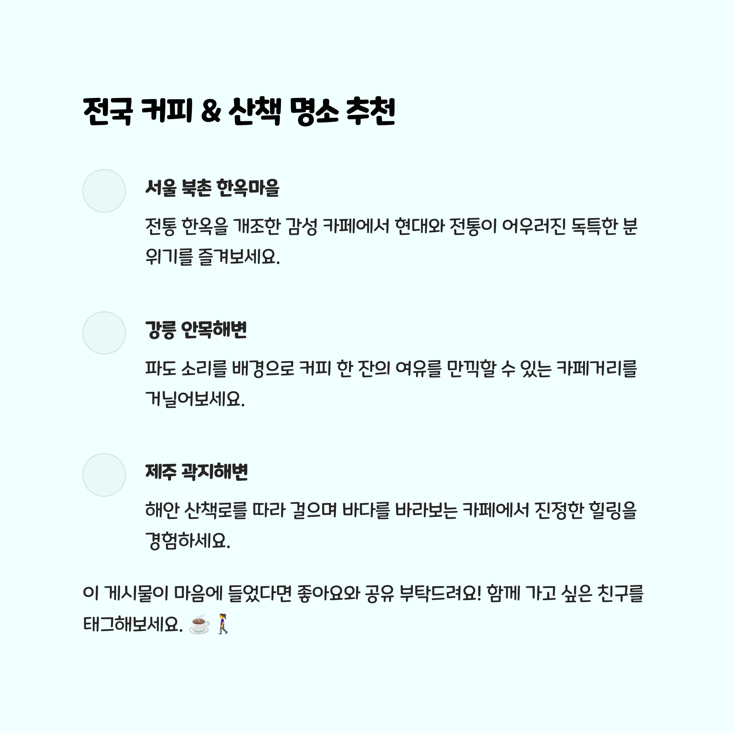그 자체가 힐링이 되는 순간인데요. 이번 글에서는 커피와 산책을 동시에