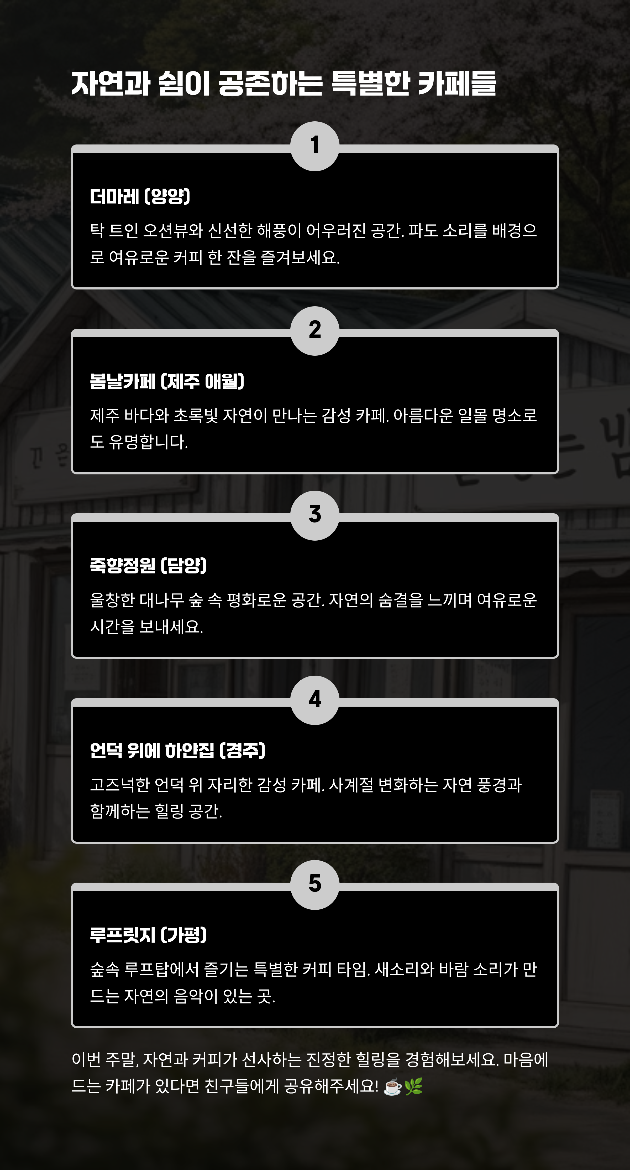 특히 자연과 어우러진 카페는 그 자체로 하나의 힐링 코스가 되죠.